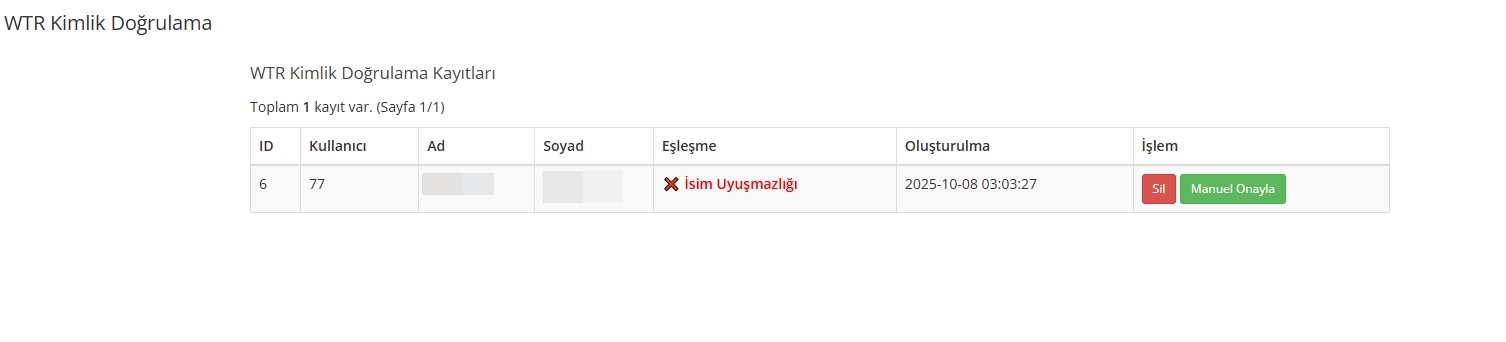 Admin Panelinden Eşleşen veya Eşleşmeyen kullanıcıları görebilir, Silme ve Manuel onaylama işlemi gerçekleştirebilirsiniz. isimleri eşleşmeyen kullanıcılar panelde işlem yapamaz.